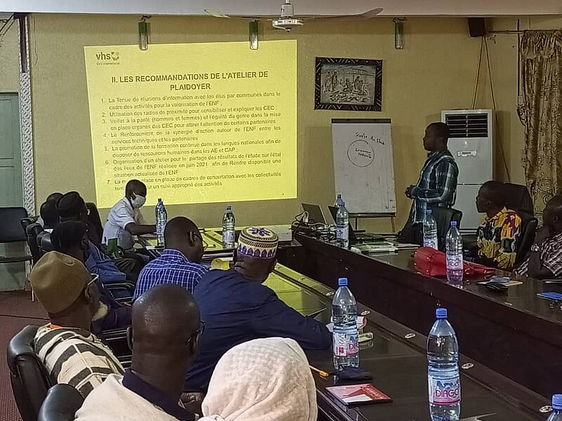 Neben anderen wichtigen Punkten des Workshops freuten sich die Teilnehmenden, dass ihnen die Ergebnisse der Bestandsaufnahme zur Situation der Erwachsenenbildung in der Region Mopti präsentiert wurden. Sie bezeichneten die Ergebnisse der Studie (Methodik, Grenzen und Empfehlungen) als sehr wichtig und dass sie auf allen Ebenen dazu beitragen werden, den Bereich der nicht-formalen Bildung in Mali sichtbarer zu machen. Die Umsetzung der Empfehlungen des Advocacy-Workshops vom Dezember 2021 soll von dem regionalen Abstimmungsgremium (Cadre de concertation) übernommen werden. Nach den Präsentationen formulierten die Teilnehmer Empfehlungen an die Abteilung für Alphabetisierung und nicht-formale Bildung der Bildungsakademie (AE), die nun das Sekretariat des regionalen Abstimmungsgremiums übernimmt, um diesen neu zu beleben. In diesem Sinne versicherte der Vertreter der Nichtregierungsorganisation Save The Children, der an dem Workshop teilnahm und die Koordination des regionalen Bildungsclusters übernimmt, den Teilnehmern, dass die EB/NFB bald bei den Treffen des Clusters berücksichtigt werde, ebenso wie die Überarbeitung des Datenerhebungsrahmens mit dem Ziel, die EB/NFB-Daten einzubeziehen.