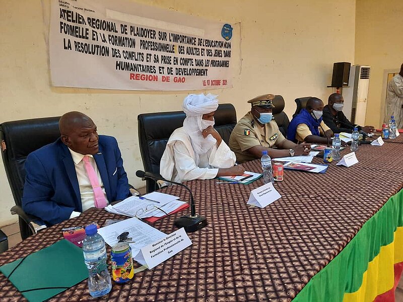 Am 7. Oktober 2021 organisierte DVV International im Sitzungssaal des Gouverneurs in Gao einen Advocacy-Workshop für die Bedeutung der non formalen Bildung und Berufsausbildung für Erwachsene und junge Menschen bei der Konfliktlösung in Nordmali als auch über deren Einbeziehung in humanitäre- und Entwicklungsprogramme. Das Hauptziel des Workshops, der unter dem Vorsitz des Gouverneurs der Region, General Moussa TRAORE, stattfand, bestand darin, alle Akteure in der Region zu mobilisieren, sich in der Erwachsenenbildung und der non formalen Bildung zu engagieren und ihr Engagement besser zu koordinieren. Das Ziel ist, die Widerstandsfähigkeit des Sektors zu stärken und darüber hinaus eine übergreifende Antwort auf die humanitären Bedürfnisse der Gemeinschaften in den nördlichen und zentralen Regionen Malis angesichts der dortigen Krise zu geben.